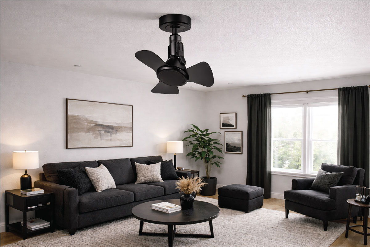 The XC-2448P04-S BLDC Corner Fan is a modern and energy-efficient cooling solution designed with advanced BLDC technology. Featuring a sleek black fan body paired with a stylish white remote control, it adds a premium look to any space. The fan operates on a wide input voltage range of 100–240V AC with 50/60Hz frequency, making it reliable under various power conditions. With a maximum power consumption of only 35W and a top speed of 900 RPM, it delivers strong airflow while maintaining excellent energy efficiency.